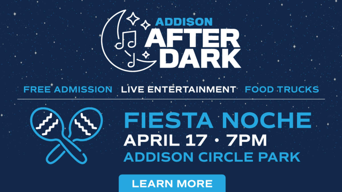 This Saturday, join Addison After Dark for Fiesta Noche at 7PM on April 17th! Free Admission, Live Entertainment, and Food Trucks!