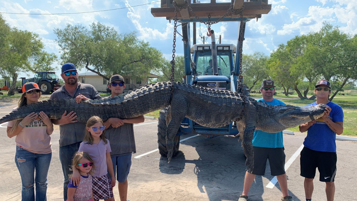 Texas Parks & Wildlife's James E. Daughtrey Wildlife Management Area congratulated local hunters who made huge catches last week — and there are photos to prove it. Families are seen huddled around their more-than-13-foot gators being held up by a forklift. Other hunters are seen posing alongside the gators sprawled out on the pavement. The alligators range from 8-feet, 10.5 inches to 14-feet, 2.5 inches.